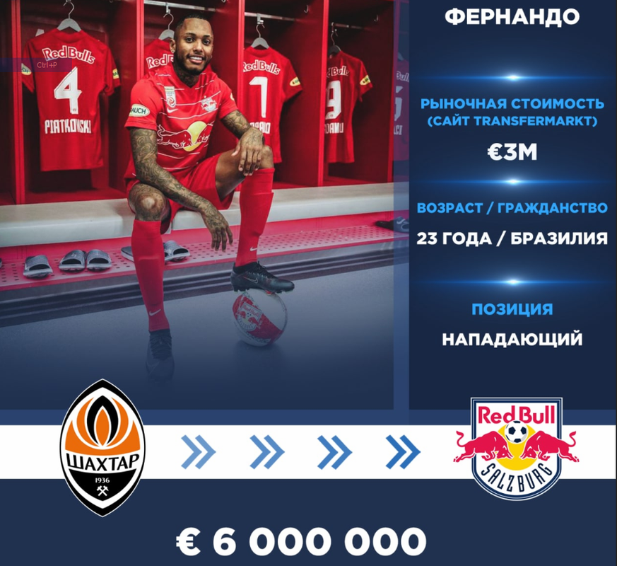 ОФИЦИАЛЬНО: Фернандо, «Шахтёр» (Украина) — «Зальцбург» (Австрия) 21.04.2022Спортadmin Официально: Фернандо перешел в «РБ Зальцбург» из «Шахтера». Сумма трансфера: 6 млн евро. Контракт с 1 июля 2022 года до конца сезона 2026/27. Не забудь поделиться новостью